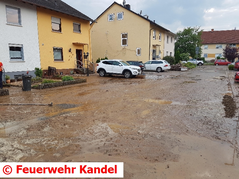 Nach einem schweren Gewitter mit Starkregen wurden im Stadgebiet Kandel mehrere Straßen sowie Keller überflutet.