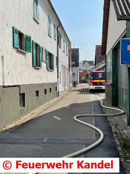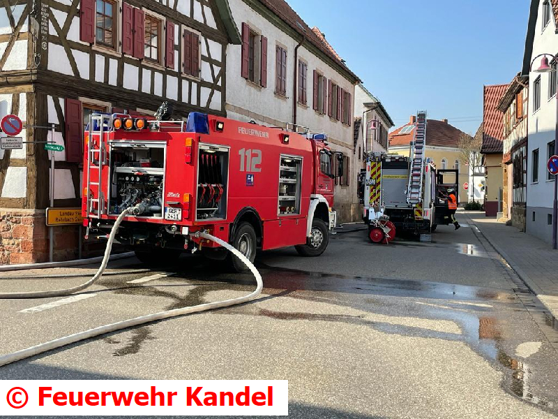 Während dem Verkehrsunfall alarmierte die Leitstelle Landau die Feuerwehren Steinweiler, Kandel und Winden zu einer Rauchentwicklung aus einem Gebäude in Steinweiler. Aus Kandel wurden umgehend zwei weitere Fahrzeuge besetzt und ein Fahrzeug vom Verkehrsunfall abgezogen. Vor Ort bestätigte sich die Meldung, daraufhin wurde vom Einsatzleiter die Alarmstufe auf „Feuer 3“ erhöht und somit Vollalarm für die Feuerwehren der Verbandsgemeinde Kandel gegeben. Zudem wurde eine weitere Drehleiter aus Herxheim nachgefordert.